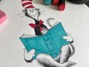 Step by step of how to sketch Cat in the Hat reading from Dr. Seuss stories